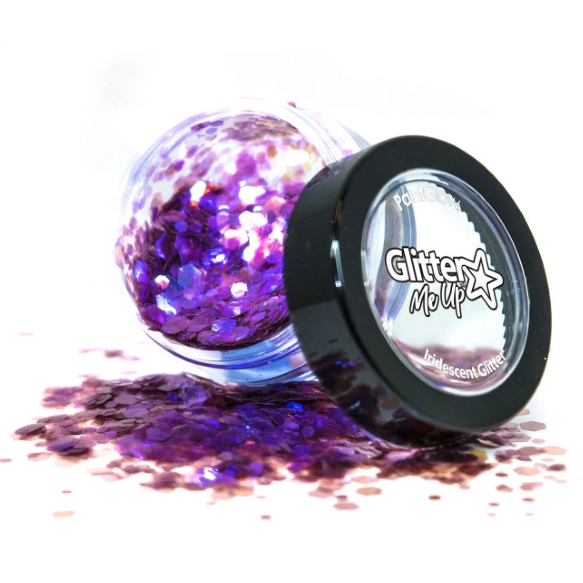 Potje met chunky glitters in de kleur paars. Voor op lichaam, gezicht of in het haar. De glitters hebben verschillende formaten wat zorgt voor een speciaal effect. Je brengt de glitters aan met een glittergel. Het potje bevat 3 gram.