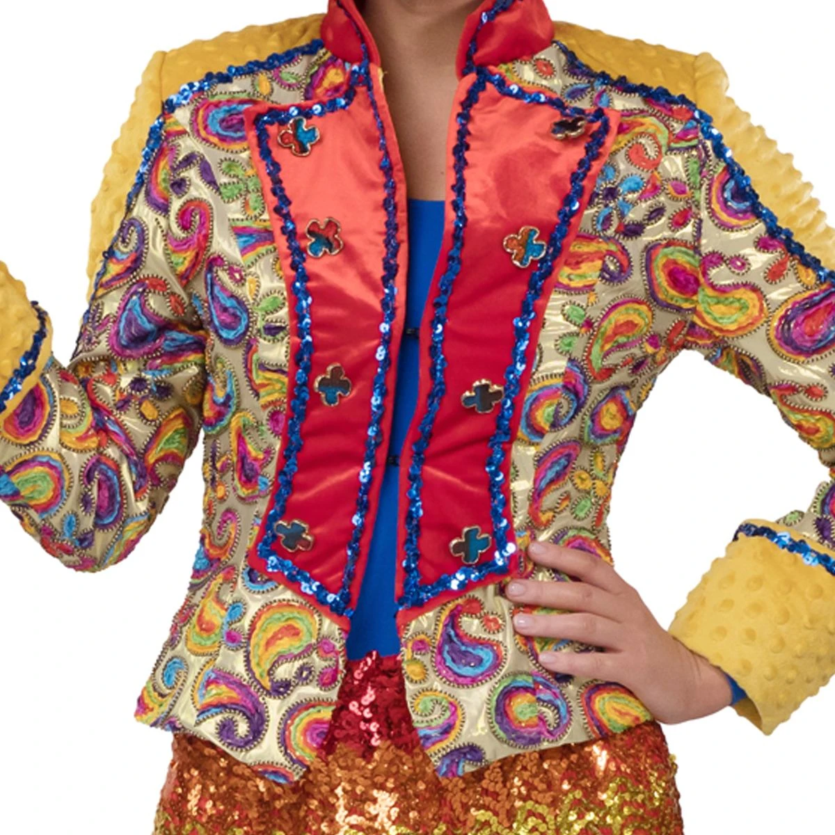 Wat een fleurig jasje! Damesjas Minki fleurt je helemaal op! Dit gevoerde jasje is gemaakt van velvet met taft en is rijkelijk geborduurd met gekleurde velvet en pailletten. De luxe knopen maken het helemaal af. Leuk te combineren met een gekleurde petticoat of glitterbroek. Van deze jas is ook een herenmodel beschikbaar.