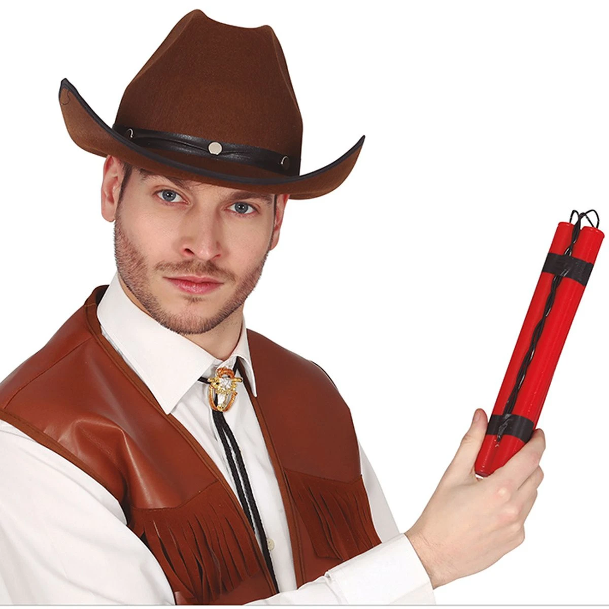 Drie dynamietstaven die aan elkaar zitten gebonden. De staven zijn 25 centimeter lang en daarmee een mooie aanvulling op jouw boevenpak, legerkostuum of cowboyoutfit!