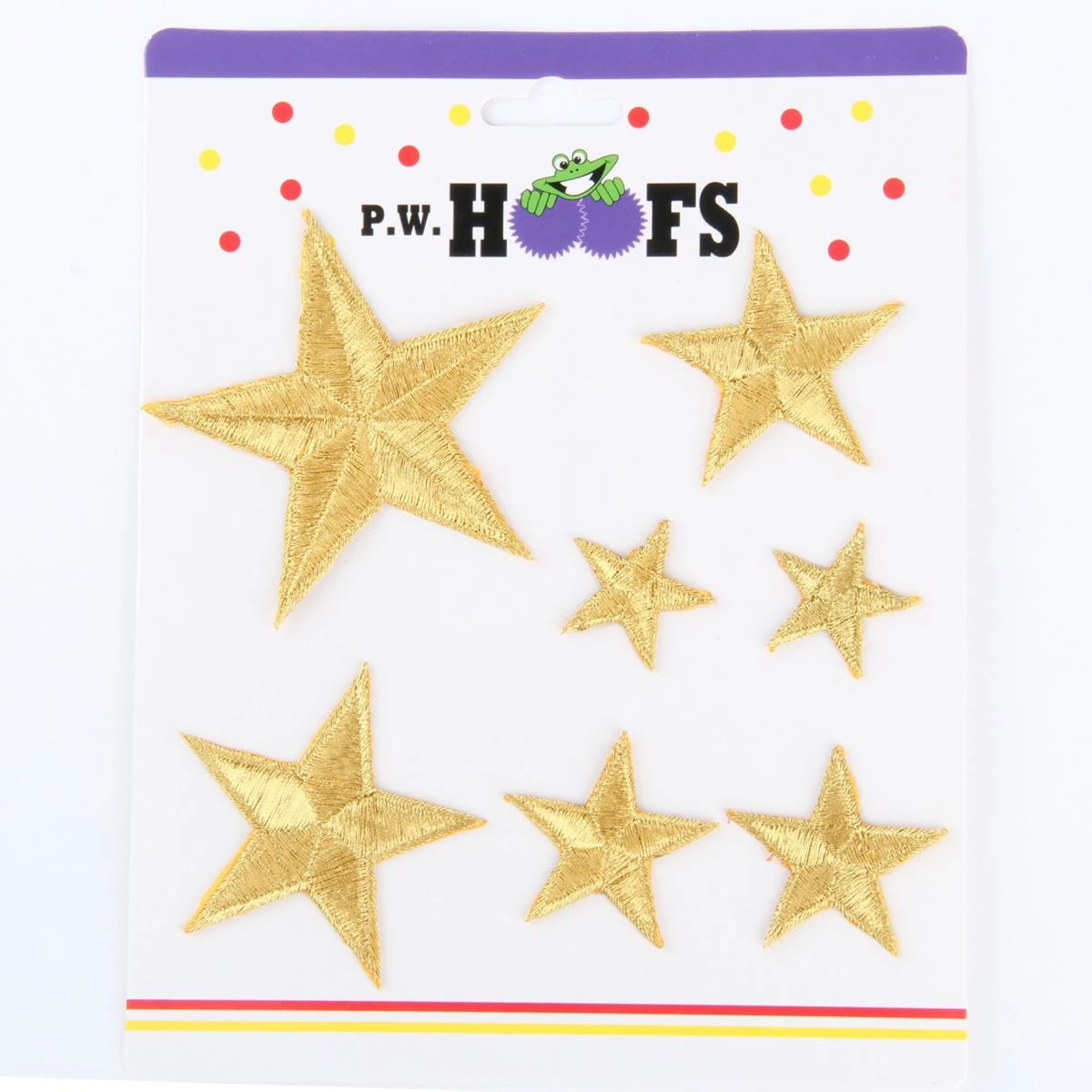 Set van 7 geborduurde gouden sterren. Met deze strijkbare sterren kun je je kleding verfraaien. De sterren hebben afmetingen van 8 cm, 6 cm, 4 cm en 2,5 cm.