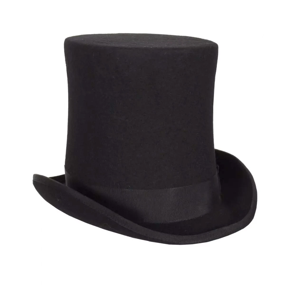 Deze cylinder hoed van 100% wolvilt is gevoerd met een 100% polyester witte satijn en is voorzien van een voeringband, de hoogte van deze hoed is 21 cm.