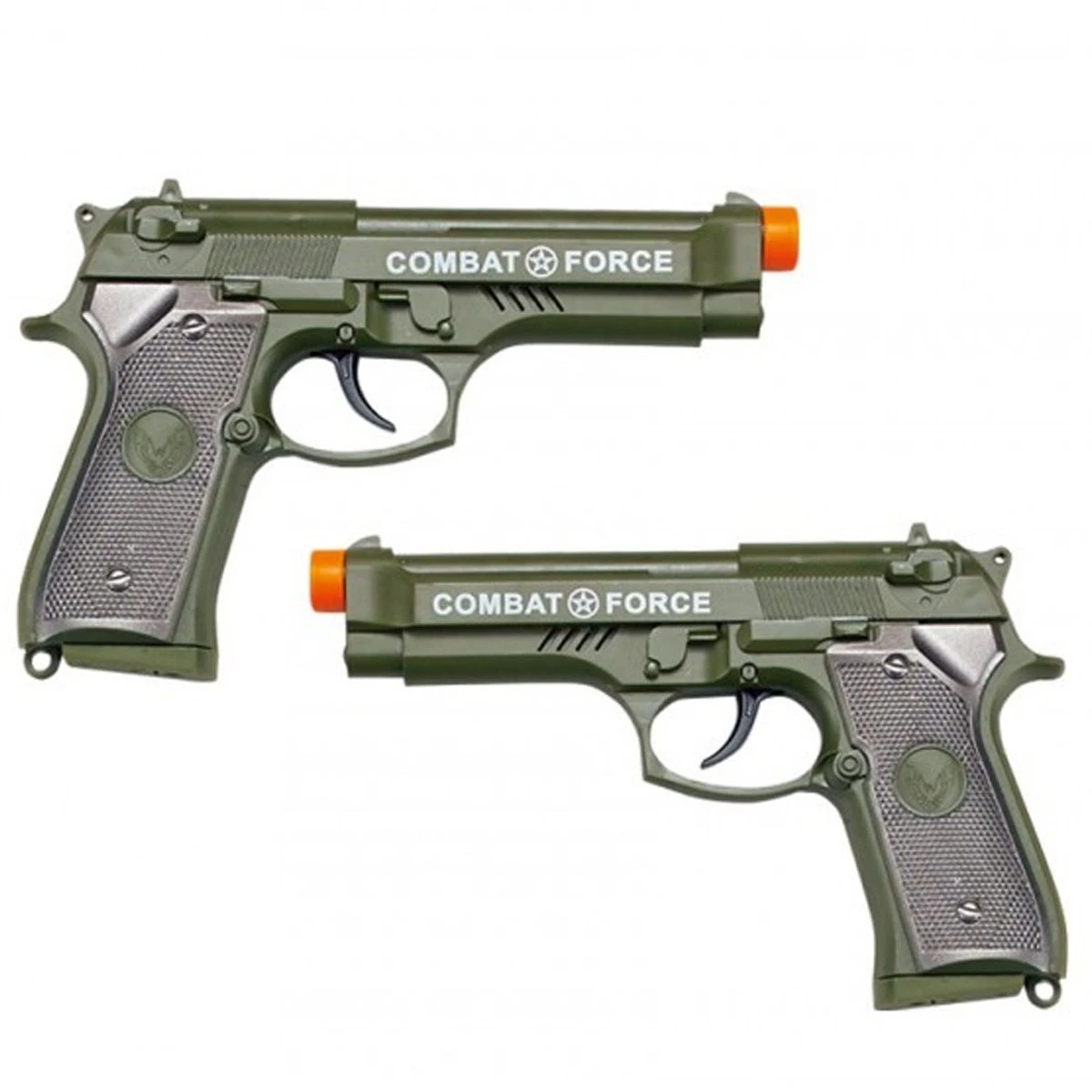 Stoer groen pistool met een zwart handvat en de tekst ‘”combat force” op de zijkant. Dit pistool is een geweldig accessoire voor bij heel veel outfits. Combineer ‘m bijvoorbeeld met een leger kostuums!