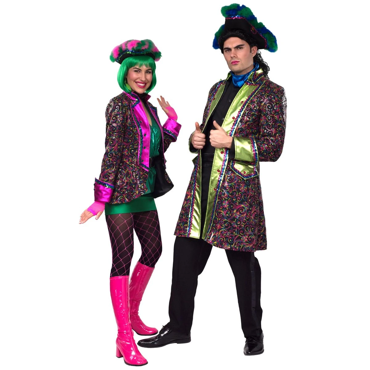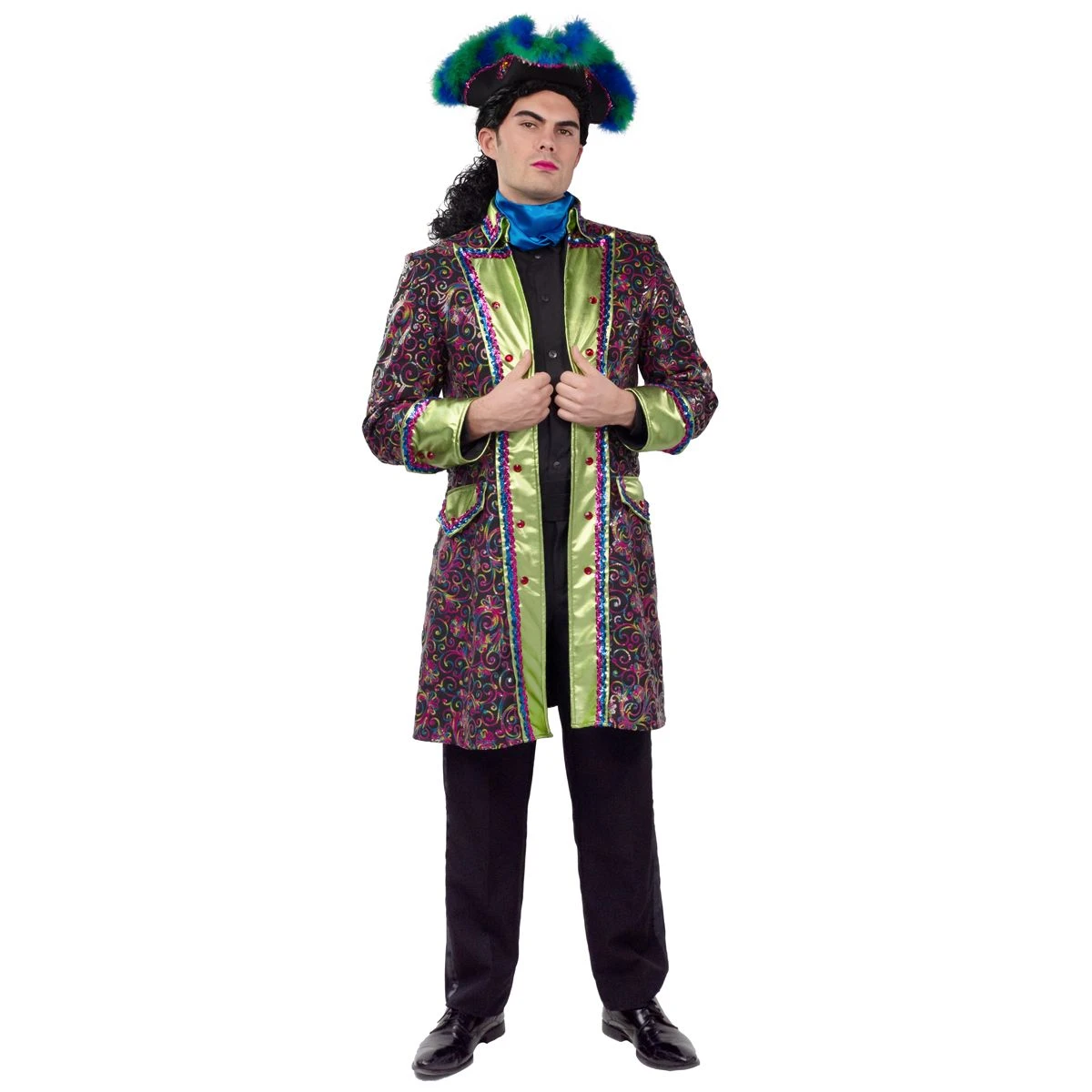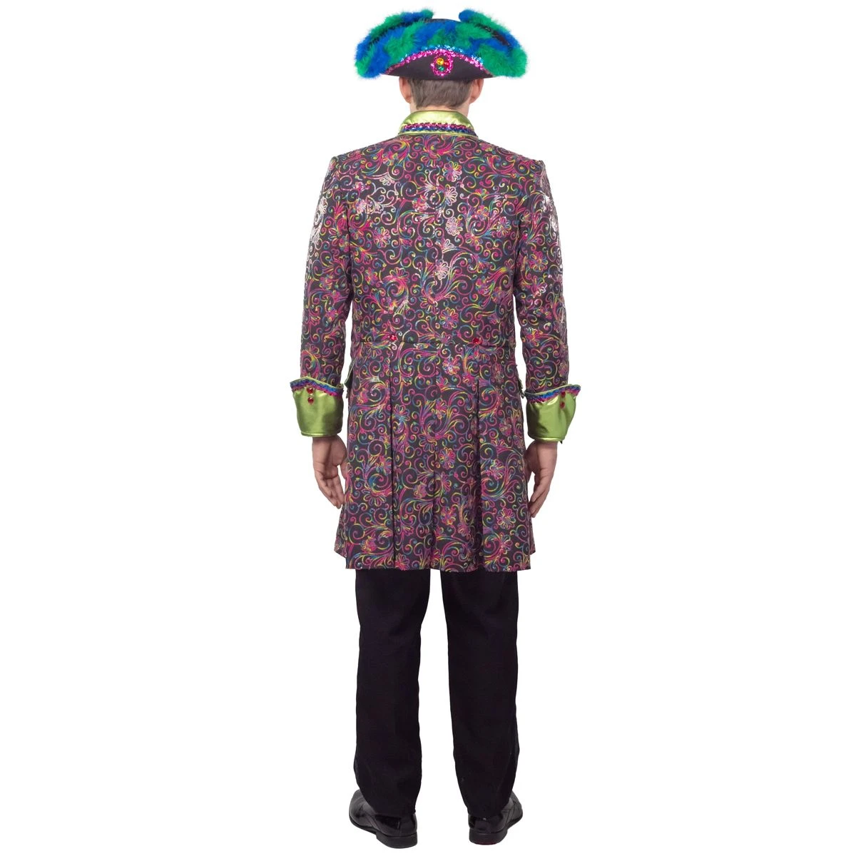 Deze lange herenjas is gemaakt van taft en helemaal bezet met gekleurde pailletjes en diamantvormige knopen. Een bijpassend damesmodel is beschikbaar om samen op chique te gaan!