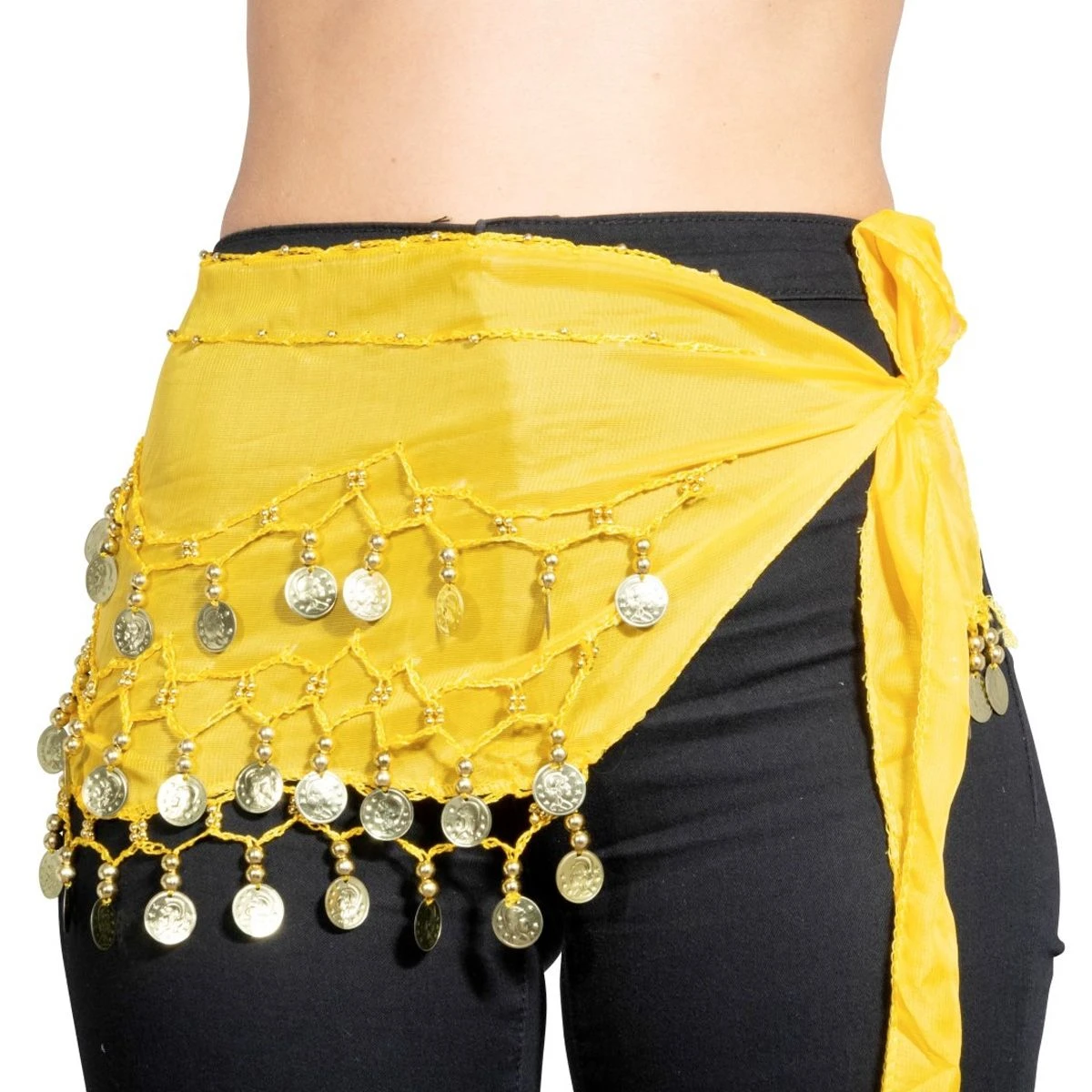 Mooie belly dance heupsjaal in geel met gouden muntjes. Deze heupsjaal voegt nét dat beetje extra feestelijkheid toe aan jouw outfit!Â