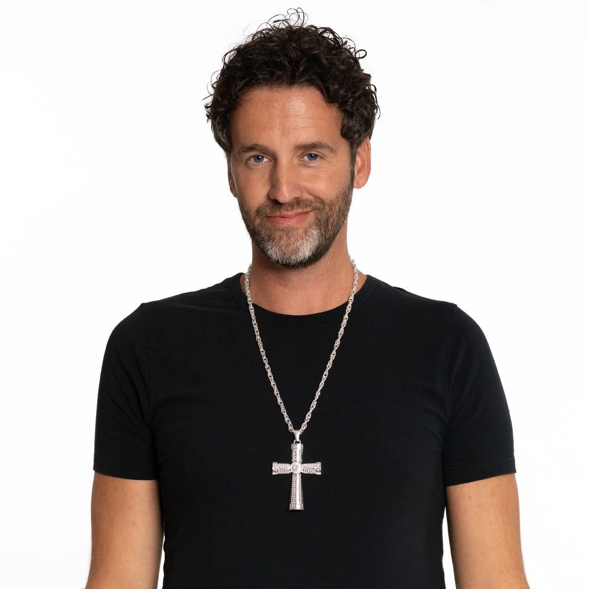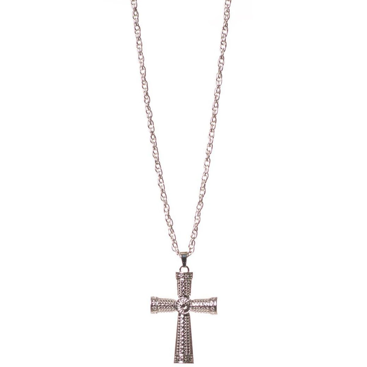 Stoere zilveren ketting met een hanger in de vorm van een kruis. Super geschikt voor heel veel outfits. Combineer ‘m bijvoorbeeld met een van onze pimp kostuums.