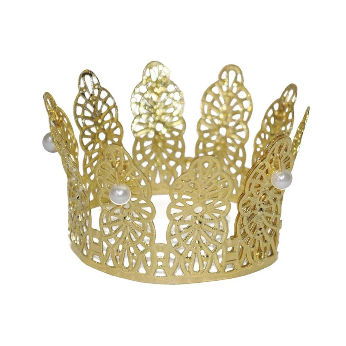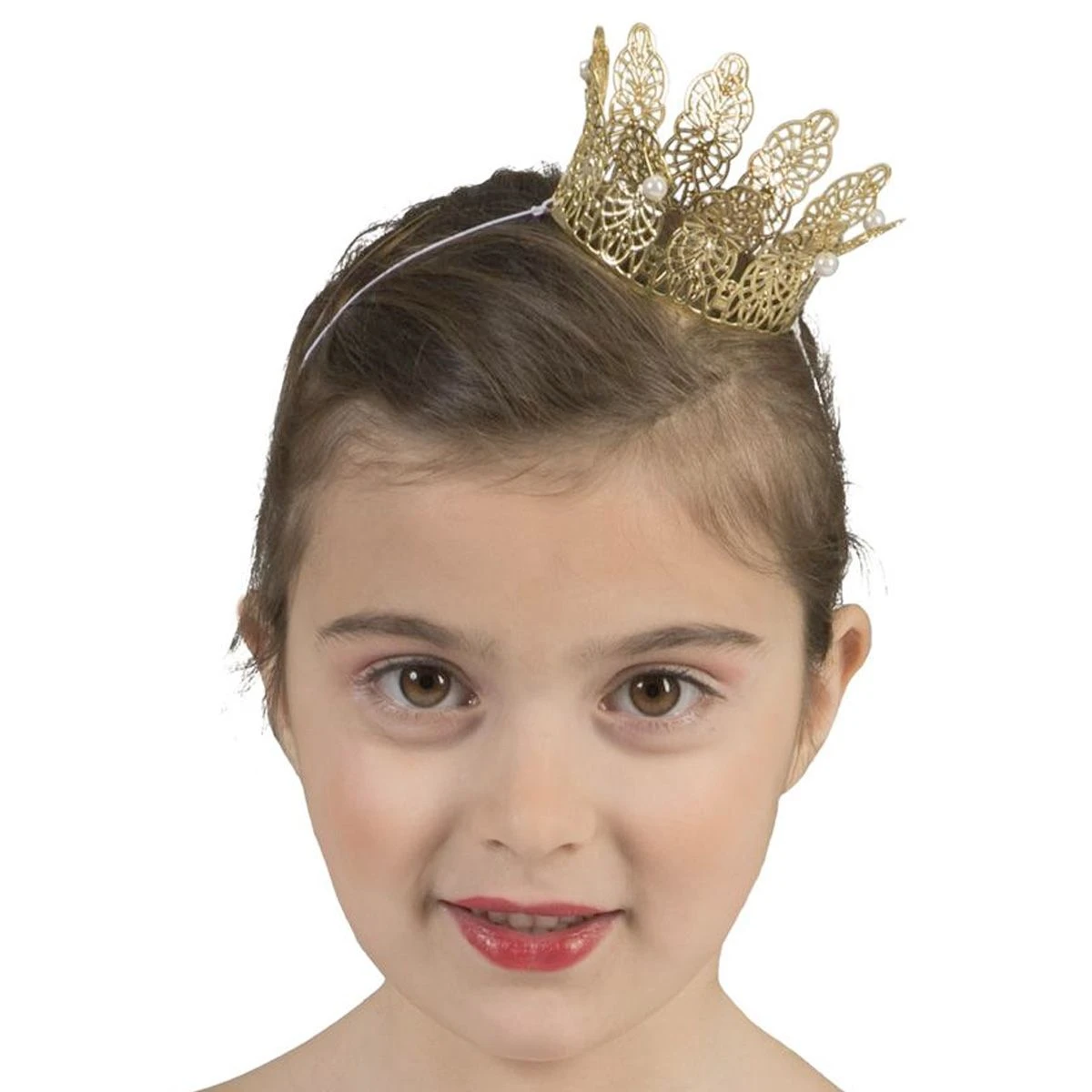 Zeer mooi gouden kroontje met pareltjes en elastiek bevestiging.
