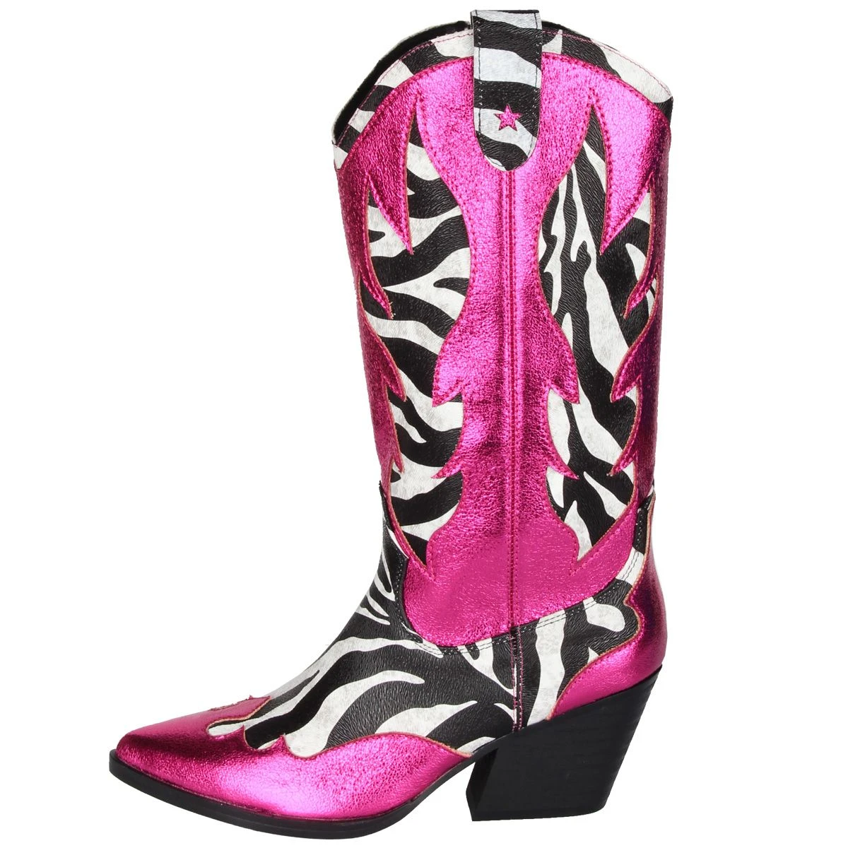 Schitterende, luxe western laarzen in een combinatie van kwalitatief hoogwaardige, metallic roze en zebraprint, kunstleder. Deze super sprankelende laarzen schitteren je tegemoet! De laarzen hebben vlammende western vormen aan de zijkant. Aan de binnenzijde zit een rits over de volle lengte, daarmee zijn deze laarzen geschikt voor zowel volle als slanke kuiten. De binnenzijde is van een zachte alcantara (voelt als suède). Het soepele materiaal zorgt ervoor dat de laarzen heerlijk dragen en een zeer fijne pasvorm hebben. Deze laarzen zijn een echte eye-catcher tijdens carnaval, een thema-feest of op een festival.