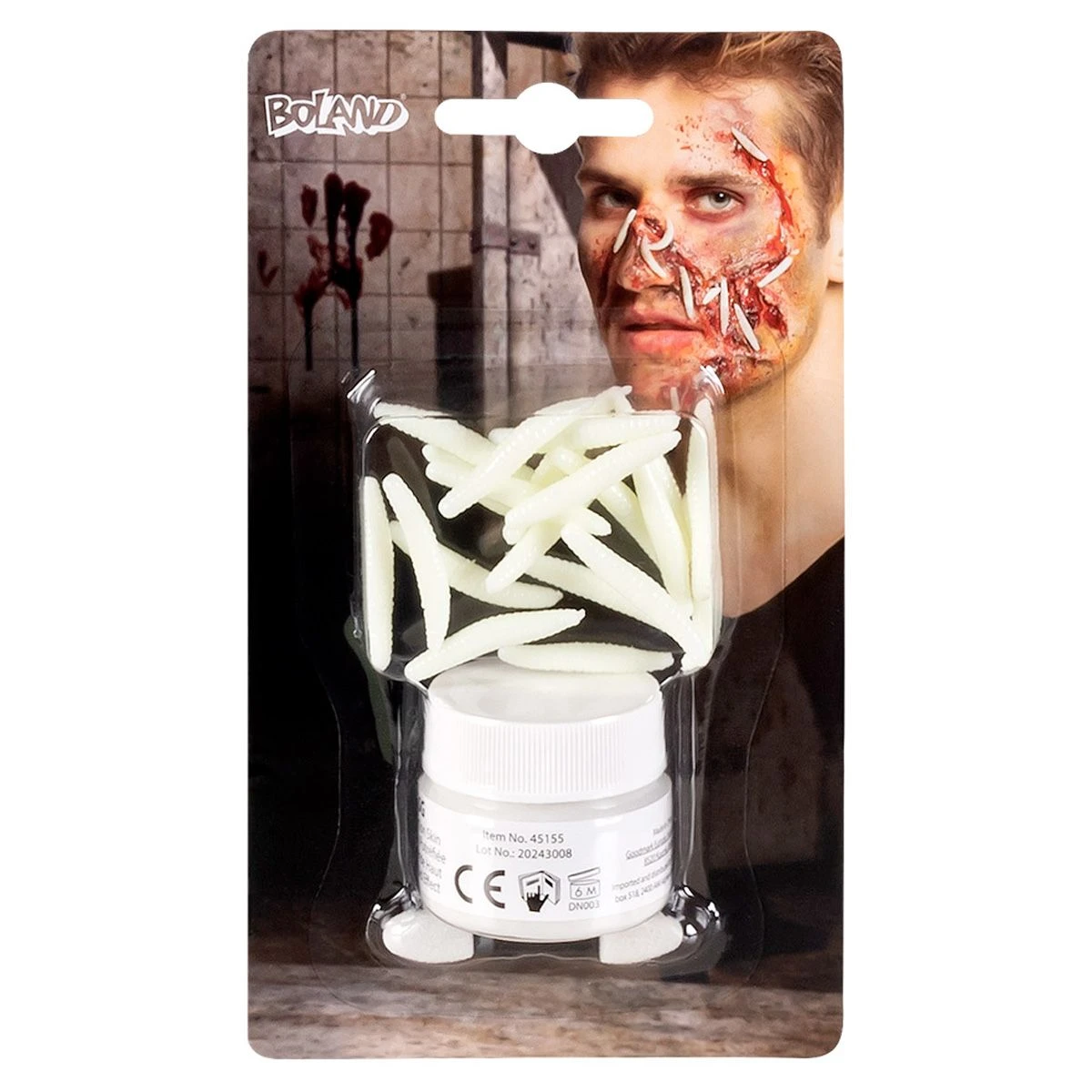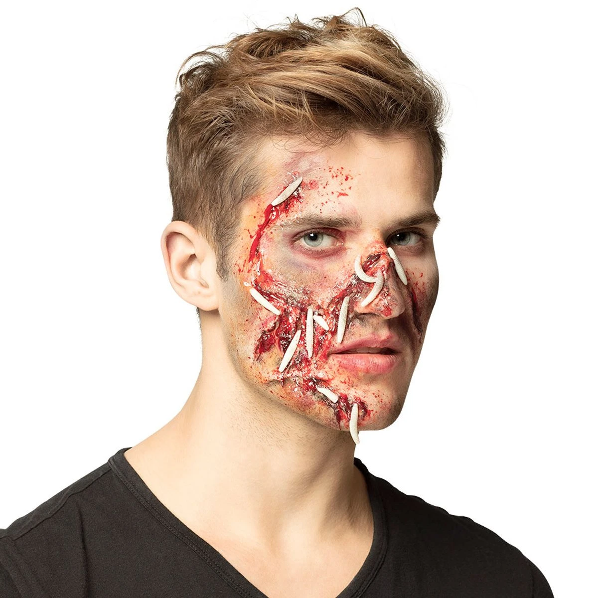Deze luxe Rottend Vlees make-up set bestaat uit: verrottingspoeder, 20 maden, dubbele applicator. Met deze set maak jij van iedereen een mega creepy zombie! Met het poeder creëer je rottende huidstructuren die je afwerkt met maden. Als de make-up is aangebracht lijkt het net of je zo van de set van The Walking Dead komt!