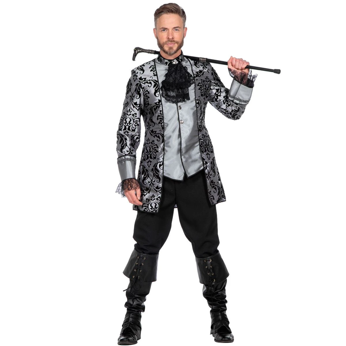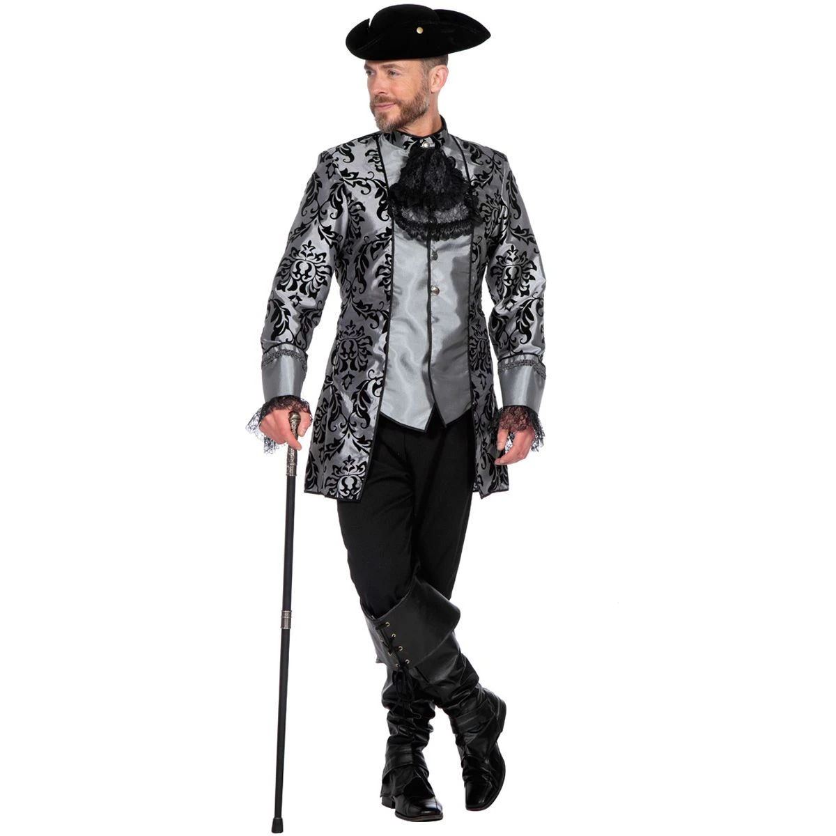 Zeer luxe markies outfit. De jas is grijs met een chique zwart patroon, kant aan de mouwen en een zwarte jabot. De broek is zwart. Maak de look af met een van onze driesteken en beenkappen!