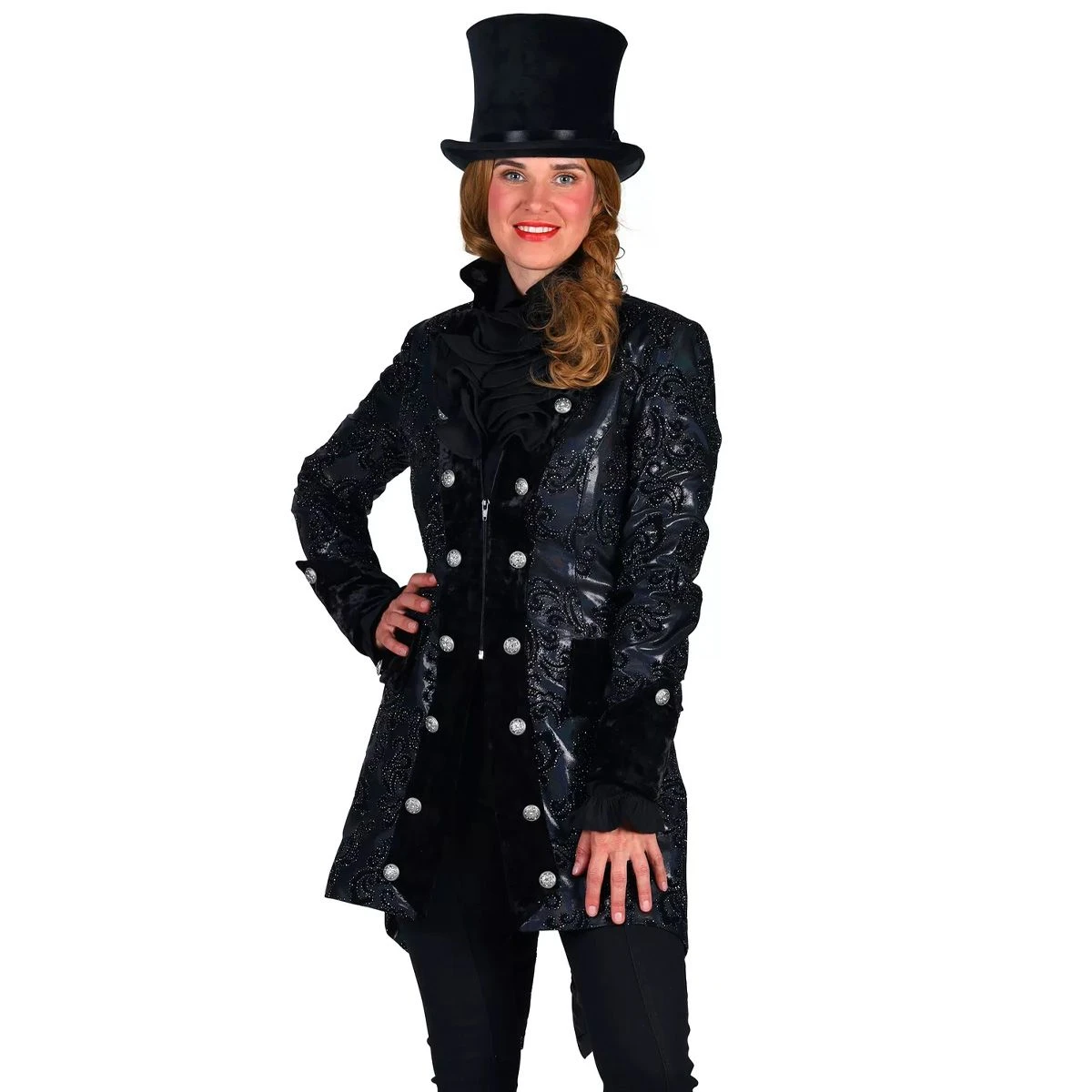 Zeer luxe markiezin jas. De jas is zwart met een chique zwart patroon, de revers zijn van zwart fluweel. Maak de look af met een van onze driesteken en beenkappen!