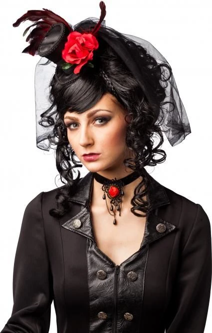 Met deze mini hoed maak je je Halloween of Steampunk kostuum helemaal compleet. Het hoedje is zwart van kleur en heeft bloemen en veren versieringen.