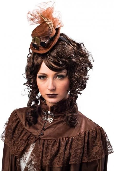 Mini hoedje Steampunk bruin voorzien van typische steampunk details zoals klokje, bril en radertje.