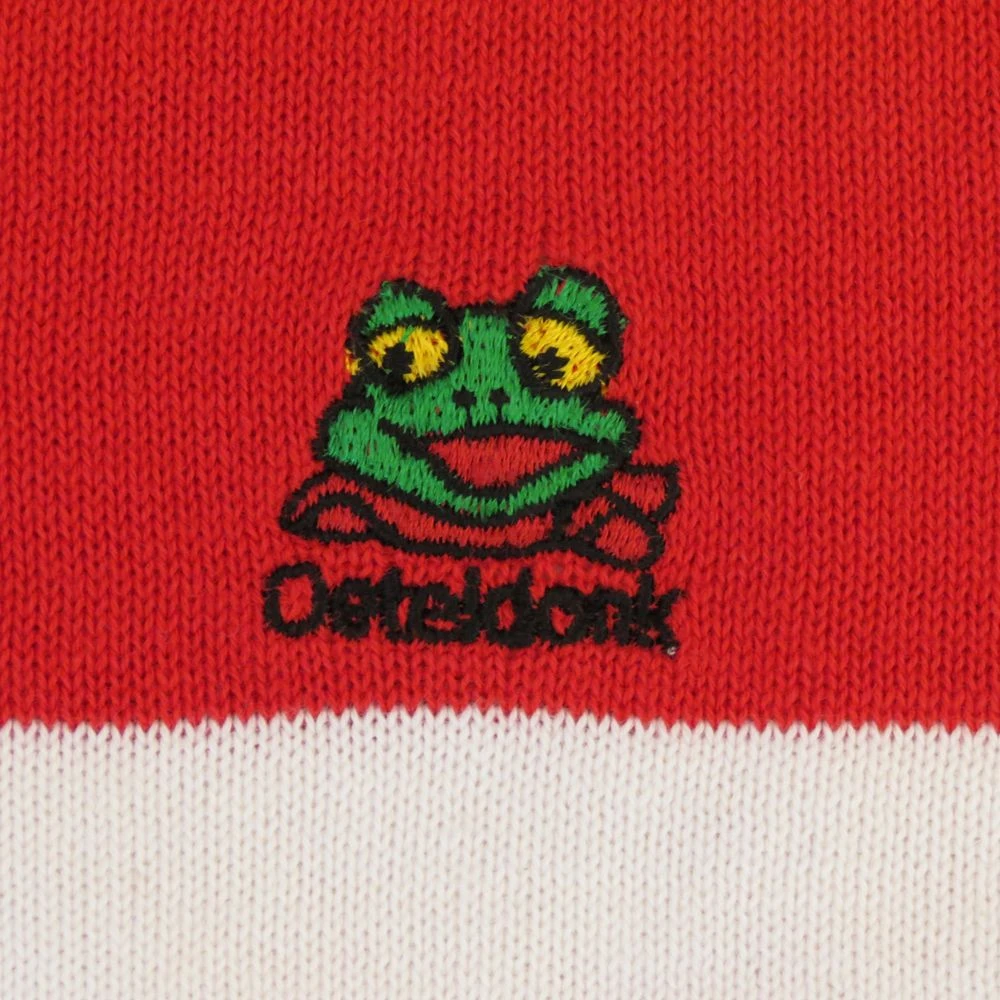 Fijn gebreide trui van 100% katoen, mooie kwaliteit, met Oeteldonk embleem geborduurd. Aansluitende hals met v-hals, boord aan onderzijde en mouwen.
