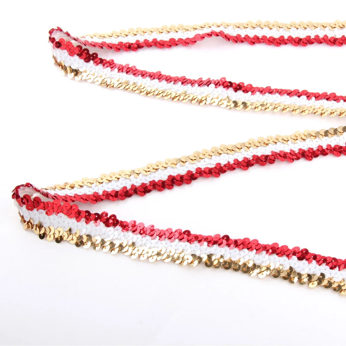 Hele mooie rood-wit-gouden Oeteldonks paillettenband, elastisch. Het band is 2 cm breed. Voor het maken van een hoofdbandje of versieren van je kiel, jasje, hoedje, tas of ter decoratie.