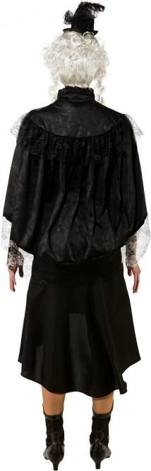 Prachtige luxe Steampunk cape voor dames in het zwart. De kanten details en zilverkleurige sluitingen geven deze Steampunk cape een mysterieuze en elegante uitstraling. Perfect om te dragen over je jurk of blouse.