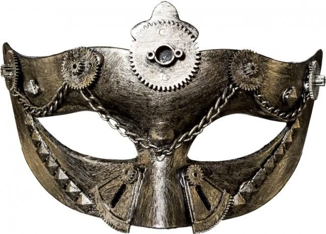 Steampunk masker zilver met typische steampunk details zoals radertjes en kettinkjes