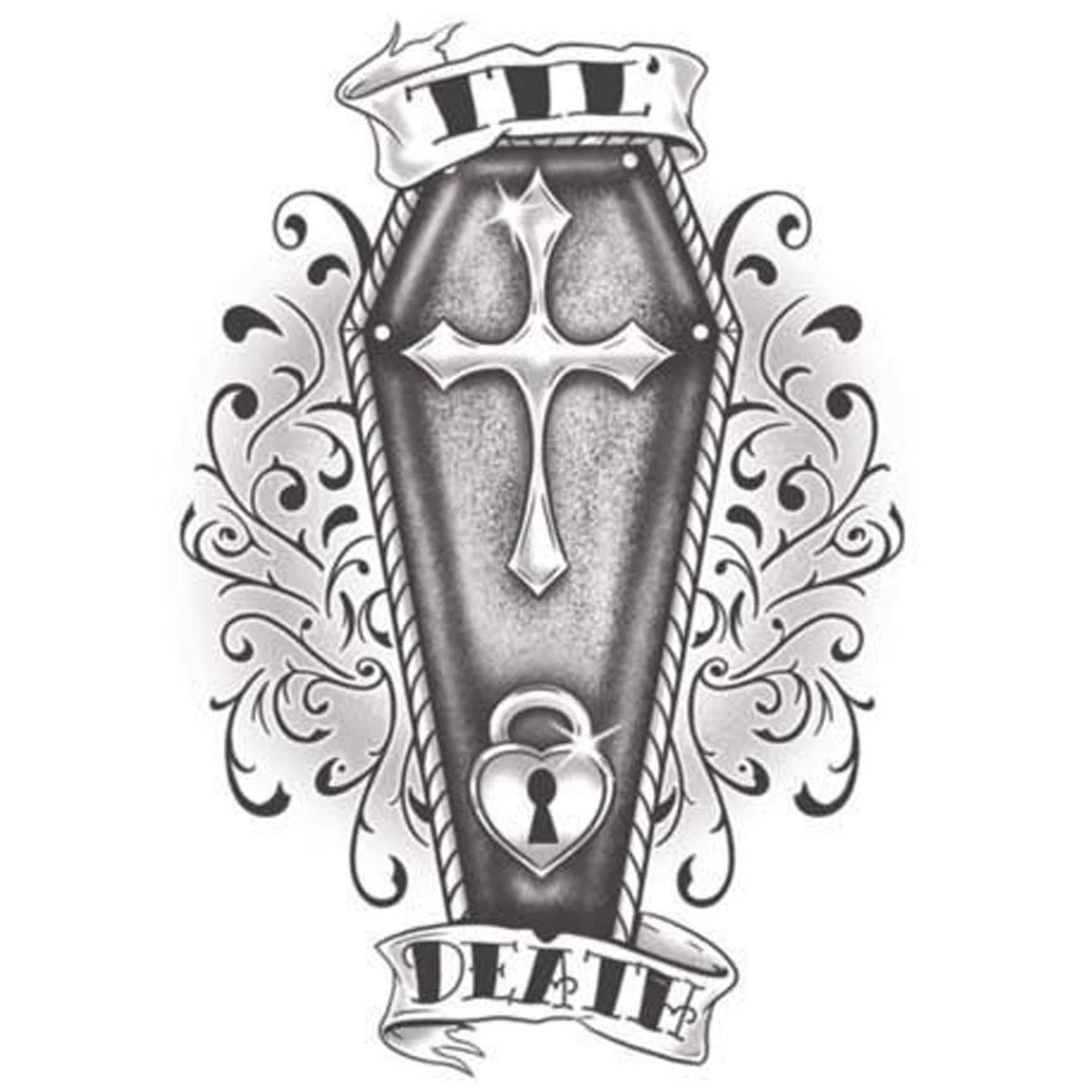 Neppe tattoo van een doodkist met de tekst Til’ Death. Eenvoudig aan te brengen!