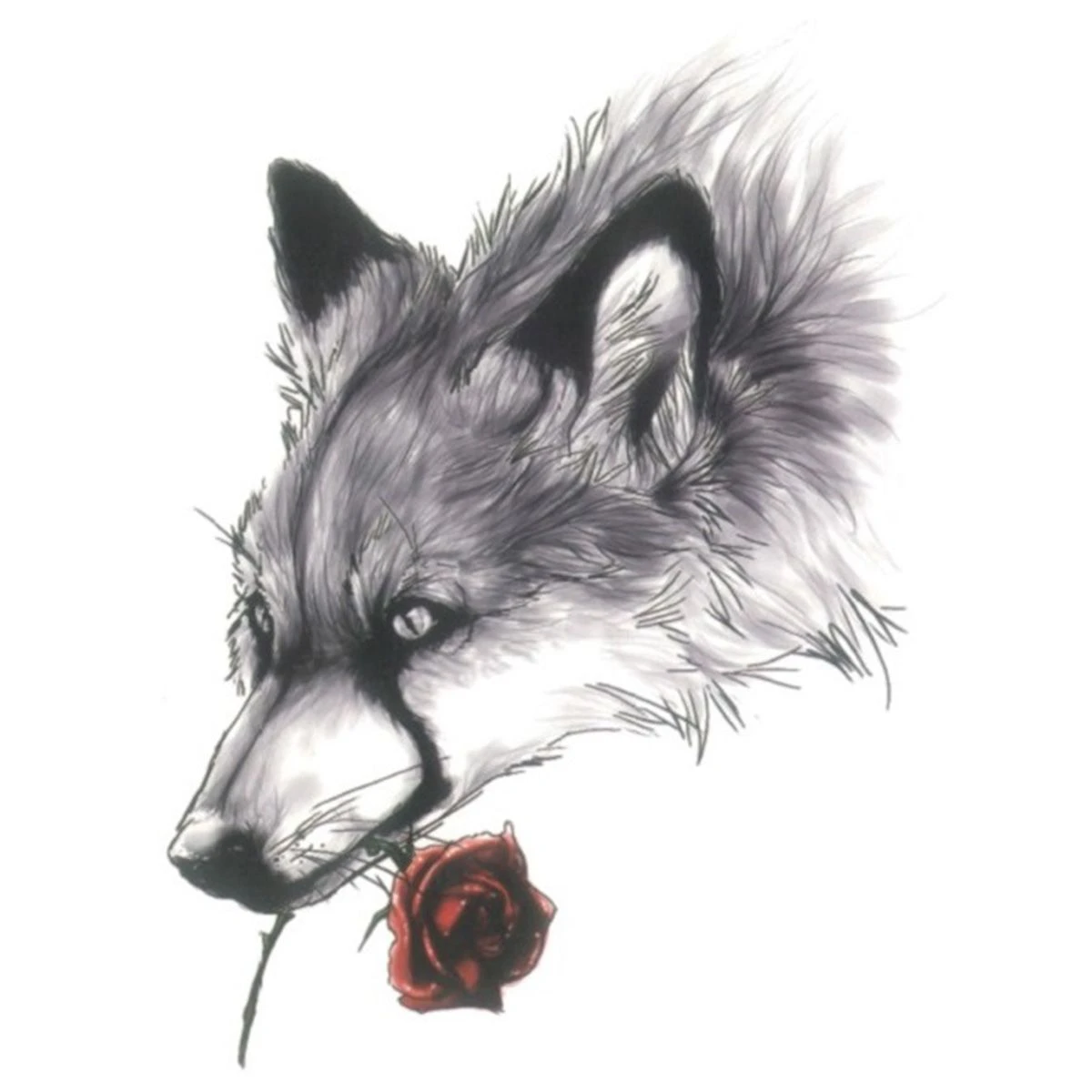 Neppe tattoo van een wolf met een rode roos in zijn bek. Eenvoudig aan te brengen!