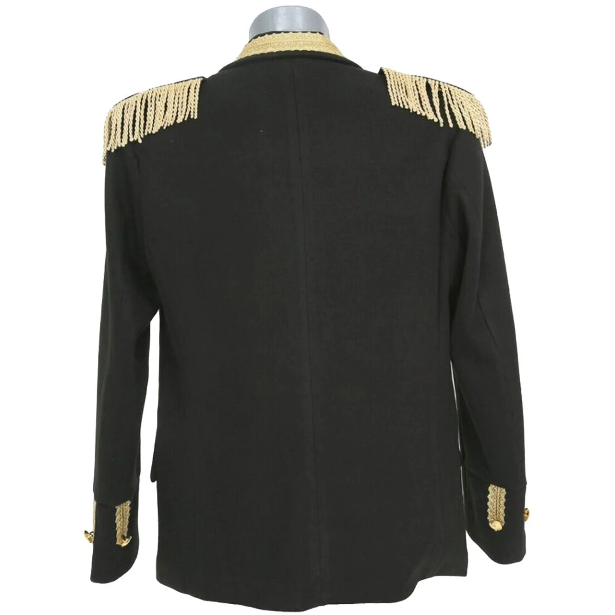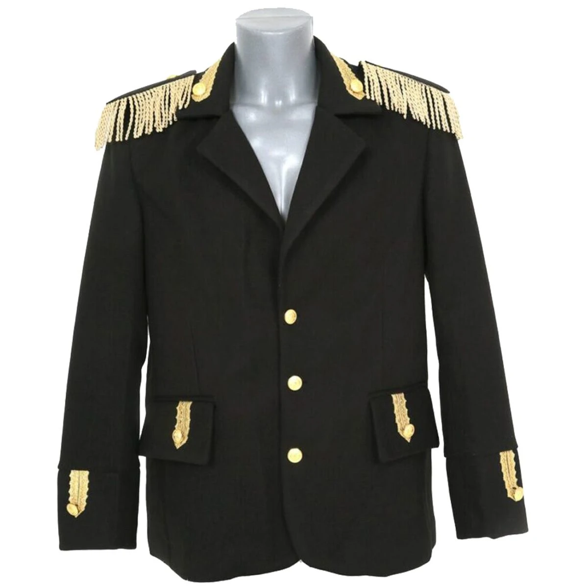 Mooie, zwarte uniformjas voor heren. Deze jas heeft mooie gouden knopen, zwart/gouden epauletten en is afgewerkt met goud brokaat band. Op de voorzijde zitten 2 handige zakken.