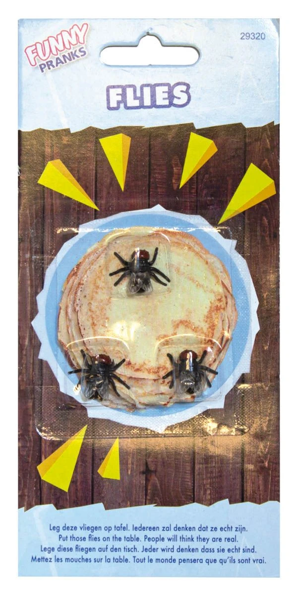 Drie vieze nepvliegen. Gooi deze vliegen op tafel voor leuke schrikeffecten.