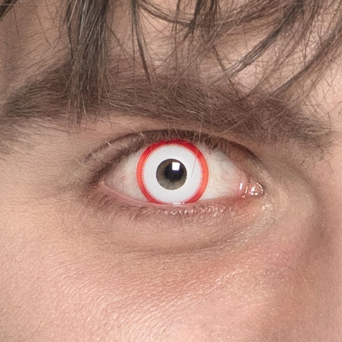 Deze witte kleurlenzen met rode rand zijn de finishing touch bij jouw Halloweenkostuum, bijvoorbeeld voor de perfecte zombie- of vampierlook!